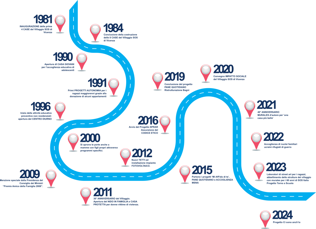 Il Villaggio SOS di Vicenza Cooperativa Sociale ETS è parte della rete SOS Children’s Villages International e SOS Villaggi dei Bambini Italia, attiva in Italia da oltre 60 anni con 8 Programmi in diverse città. Ogni anno, SOS Children’s Villages International si prende cura di migliaia di bambini, ragazzi e famiglie in difficoltà, promuovendo i loro diritti e il loro benessere.